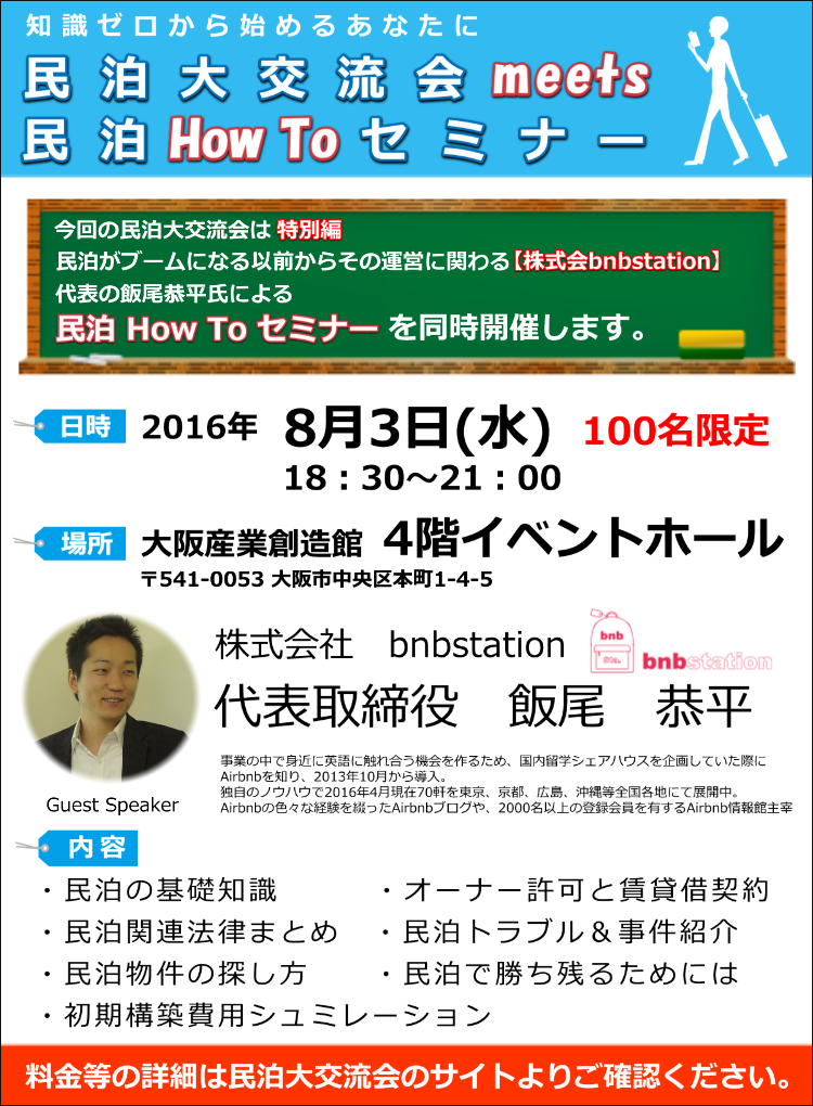 民泊大交流会【特別篇】の大阪開催がいよいよ来月、8/3(水)の開催となりました。