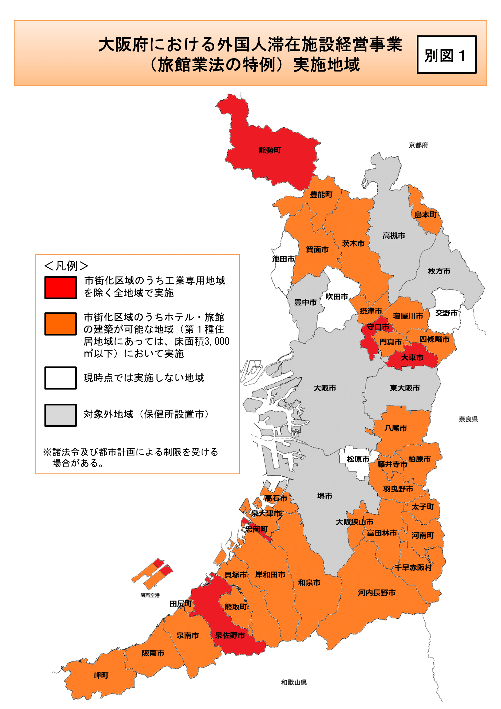 | 泉南市 | 市街化区域のうちホテル・旅館の建築が可能な地域 (第1種住居地域にあっては、床面積3,000㎡以下)において実施 |