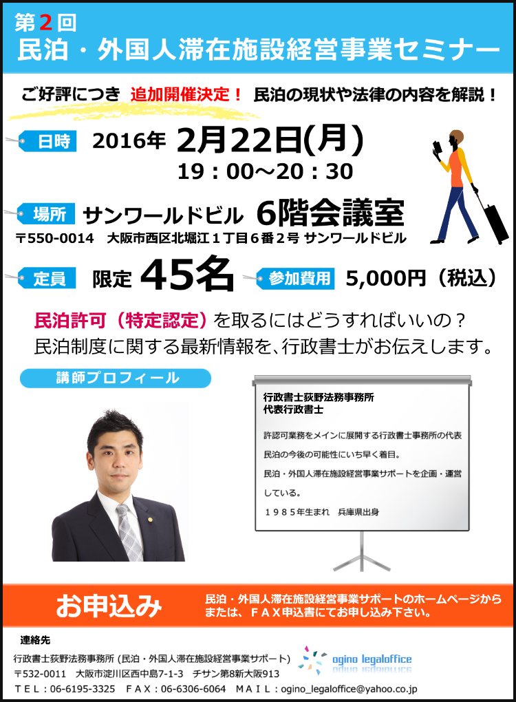 ※当セミナーにご参加頂いた方は、民泊・外国人滞在施設経営事業サポート(行政書士荻野法務事務所)が今後開催する民泊関連のセミナーに無料ご招待いたします。セミナーは年数回の開催を予定しております。(大阪での民泊条例運用直前に2回目(実践編)のセミナーを計画中です。)