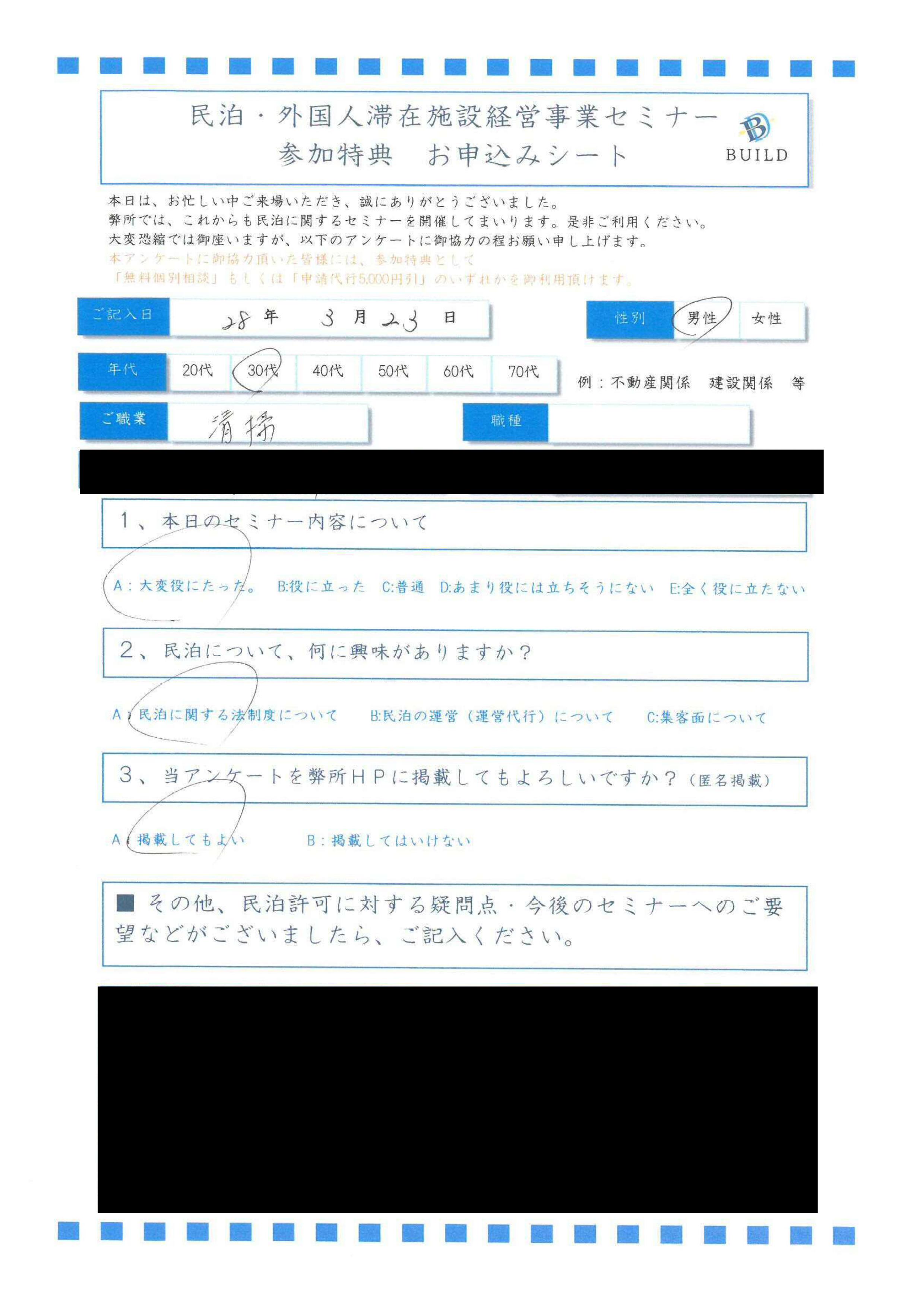 前回のセミナーから感じていたことですが、参加者様の関心が民泊許可(特区民泊)から徐々に旅館業(簡易宿所)の方へとシフトして行っているように思います。実際に弊所へのお問合せも旅館業(簡易宿所)に関するものが増えて参りました。